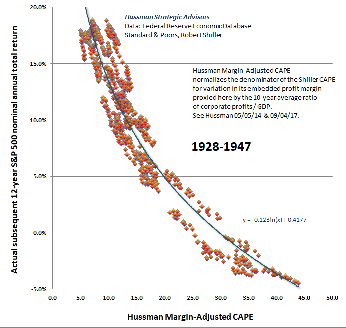 To see this, the charts below break the period from 1928 to the present into four segments: 1928-1947, 1947-1967, 1967-1986, and 1986-present (though since we’re looking at subsequent 12-year market returns, we only have full data on that last period through October 2006). Each scatter plot shows our Margin-Adjusted CAPE on the horizontal axis, along with the actual subsequent 12-year average annual nominal total return of the S&P 500 on the vertical axis. Though it’s not necessary, there’s also a regression line and equation on each, just for fun. As usual, for reasons I’ve detailed elsewhere, the proper way to relate valuations to subsequent market returns is to use log valuations.