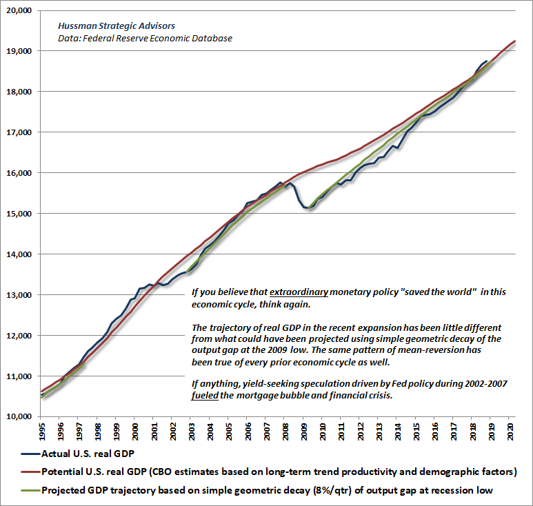 The recent bull market clocked in as the longest in history. Even if the September 20, 2018 peak in the S&P 500 was the final high, the preceding advance outlived the 1990-2000 bull market by nearly 8 weeks. Likewise, the current economic expansion is just 3 months shy of the record 10-year expansion that ended in early 2001, the unemployment rate is down to just 3.8%, the entire post-crisis gap between actual real GDP and the CBO estimate of potential real GDP has been eliminated, and the expansion has already outlived the previous runner-up, which ran from 1961 to the end of 1969.