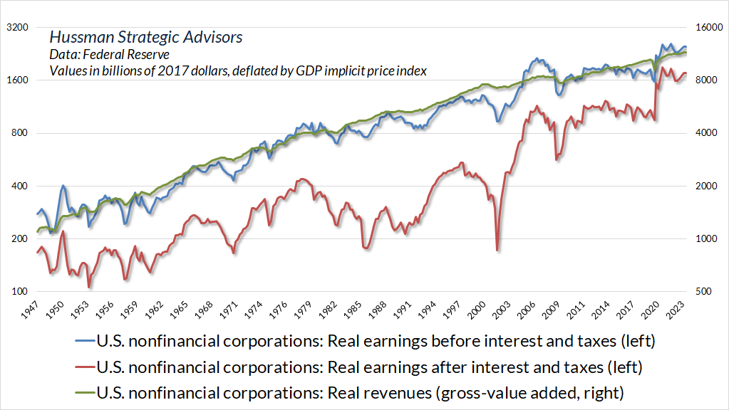 I realize that many investors are inclined to dispense with price/revenue multiples, and even valuations altogether, in the belief that economic dynamics have changed and that profit margins will maintain a permanently high plateau. On that argument, as I detailed in the March comment, Universal Capitulation and No Margin of Safety, the fact is that profit margins of U.S. nonfinancial corporations, before interest and taxes, haven’t changed materially in 75 years.