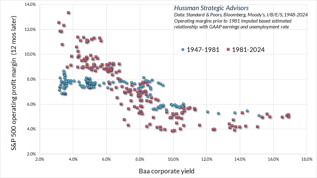 That leaves declining interest costs from 1980 to the present as the clear driver of profit margin expansion in recent decades. It should not be a surprise, then, that S&P 500 operating margins since the 1980’s have been well-correlated with the corporate bond yields. Indeed, that correlation has gradually increased because the ratio of corporate debt to corporate revenues has approached 1-to-1.