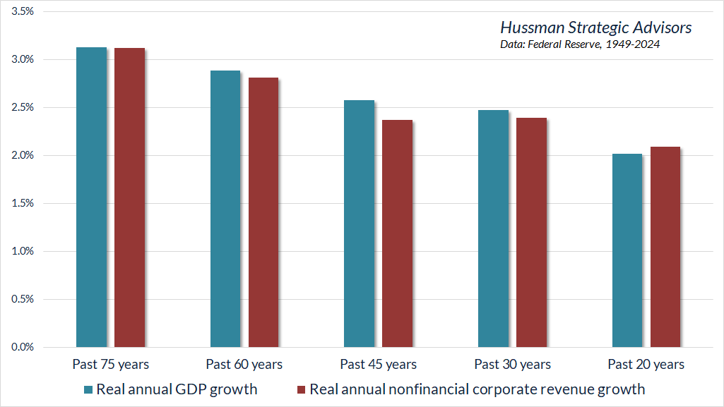Yet despite the rise and dominance of the internet, smartphones, advanced semiconductors, social media, and process efficiencies driven by technology, real U.S. GDP growth and real U.S. corporate revenues have grown slower, not faster, over the past 20 years than during the past 30, 45, 60, and 75 years.