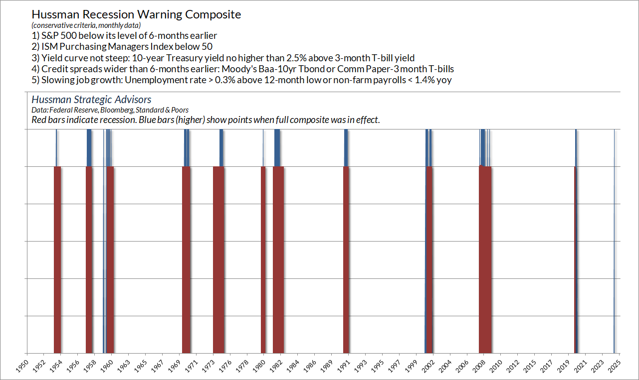 The most reliable leading indicators have moved to a clear warning of U.S. recession. This signal includes our own composite of leading indicators (credit spreads, maturity spreads, S&P 500, and NAPM Purchasing Managers Index), as well as reliable confirming indicators such as housing starts and real liquidity growth. Our investment position does not require a recession to be effective, and we do hope that these warnings are incorrect. In a stock market priced for rapid earnings growth and economic perfection, the downside risk will be extreme even if this economic slowing stops short of an actual contraction.