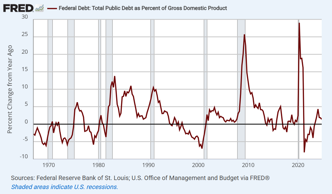 The deterioration in that red line isn’t driven by the 0.1% of GDP the U.S. spends on humanitarian aid, nor the 0.3% of GDP the U.S. spends on supplemental nutrition assistance (SNAP) for the poor. It’s driven by a repeated, persistent tendency to respond to recessions and financial crises with “stimulus” plans that combine tax cuts (as in 2017) with massive, indiscriminately targeted rescue packages (as during the global financial crisis and the pandemic). These crisis-related deficits have been far and away the largest source of expansion in the Federal debt in recent decades. Military spending, particularly in the years following 9/11, has been a secondary contributor.
