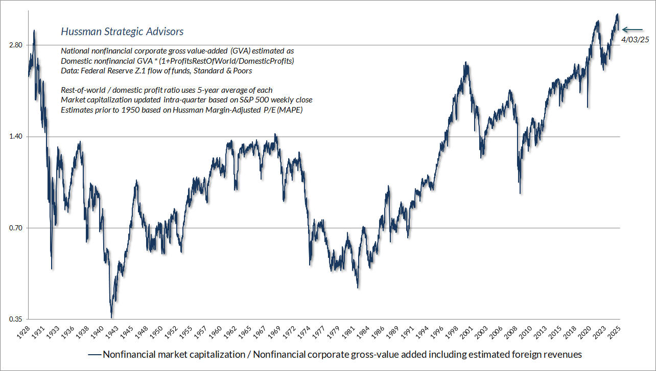 The chart below shows our most reliable valuation measure, based on its correlation with actual subsequent S&P 500 total returns in market cycles across history, in data since 1928. The blue line shows the market capitalization of U.S. nonfinancial equities as a ratio to their gross value-added, including our estimate of foreign revenues. MarketCap/GVA presently remains beyond both the 1929 and 2000 extremes.