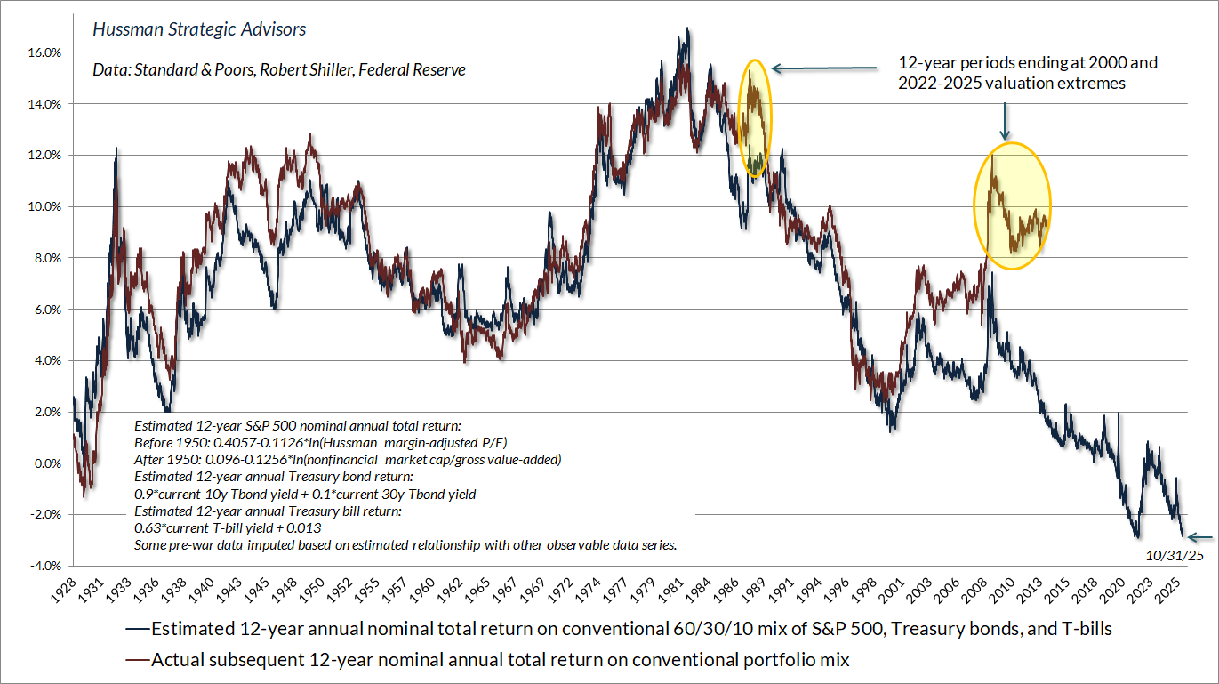 The chart below shows our estimate, as of October 2025, of expected 12-year nominal total returns for a conventional passive portfolio mix invested 60% in the S&P 500, 30% in Treasury bonds, and 10% in Treasury bills (blue) along with the actual total return of that portfolio (red) for periods where the full horizon has been completed. Notice that actual returns tend to “lift away” from their corresponding 12-year projections when the end of the investment horizon occurs at extreme valuations. These deviations reflect the accrual of speculative gains, which tend to be surrendered during subsequent market collapses.