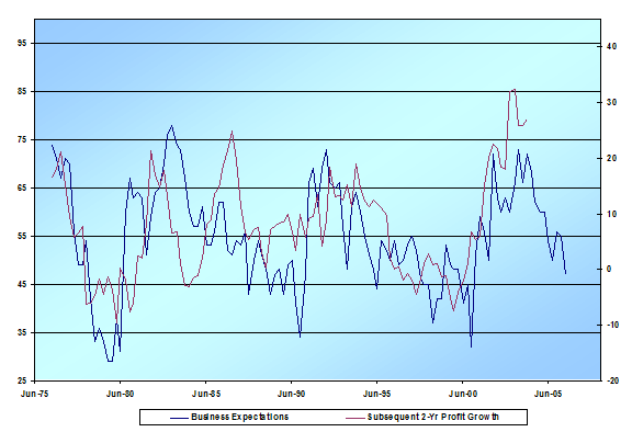 Record Profits Don't Excite Corporate Executives William Hester, CFA August 2006 All rights reserved and actively enforced. "Anchoring" is one of the most common behavioral traps that ensnare investors. Anchoring is the tendency to be influenced more by recent events than by the distant past. It happens so frequently in the financial markets that it's usually not worth highlighting. That is, unless you observe a group that usually anchors, but suddenly doesn't. That's the situation now. This earnings season brings a lot of excitement. Recovering from its deep recession lows, the S&P 500 has 16 quarters of double-digit operating earnings growth under its belt - a record-setting performance according to S&P. It looks like another quarter of profit growth is just about in the bag. S&P analysts expect earnings to grow 12 percent in the second half of the year, versus the same period last year. This optimism about the next few quarters is understandable. A four-year trend is a sufficient period of time for people to anchor their expectations. And it's not surprising that analysts and investors are influenced by recent strength. The catch is that there's one group that should be anchoring but isn't. This group is made up of the CEO's of the largest companies, and the absence of this group's bullishness may turn out to be an important indicator. You can see this in the graph below. The blue line is the "expectations" component of the Conference Board's CEO Confidence Measure, a quarterly survey asking bosses about their confidence in the economy. Figures above 50 mean executives are upbeat about the near future, while readings below 50 signal growing pessimism. The violet line shows the actual change in corporate profits over the following two years (and therefore ends in the first quarter of 2004).