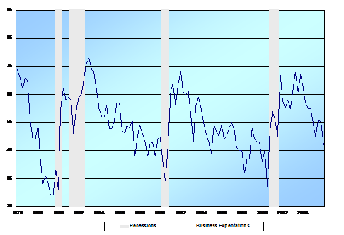 Look at the recent divergence. Corporate profits (at the national level) are still rising nicely, just like those reported by the companies in the S&P 500. And in the past, booming profits have usually meant an upbeat mood in the executive suite. But this month, the Conference Board reported that the CEO expectations index (the blue line and measured on the left axis) fell below 50 - the first time this has happened since 2000. Two trends seem to be observable in the expectations index. Recent profits seem to play a role in the current confidence of CEOs. Sustained increases in CEO confidence are often aligned with improving profits. There's also a predictive element to the survey. Since 1976, when CEO optimism has risen above 55, the subsequent 12-month growth in profits has averaged 12 percent. When the index was below 45, indicating pessimism, profits grew at just 1.1 percent. That's what makes the current split between CEO confidence and profits interesting. Poor corporate performance would explain any pessimism. But executives are lowering their expectations despite impressive earnings gains. We'll need to wait on the remainder of this year's earnings data to judge the current predictive component of the index. Not In My Yard In addition to what CEO's are expecting over the next six months in the broader economy, the Confidence Survey reports the answers to three other questions: How do CEO's feel about the current conditions of the U.S. economy? How do CEO's feel about the current conditions in their own industry? What are their expectations for their own industry six months out? A small, but interesting divergence has occurred among the answers to two of these questions. Since the beginning of the year CEO expectations for the over-all economy have dropped 9 points from 56 to 47. But forecasts about the outlook for the industries that the CEO's do business in have held up better, dropping just 4 points from 56 to 52. So CEO's have turned more pessimistic about the overall economy than the industries that they compete in. This industry-dependent optimism may help explain why merger and acquisition activity has held up in certain sectors, but more wide spread capital investment has been limited. Last Friday's GDP report showed that spending by businesses on equipment and software fell 1 percent in the second quarter, the first decline since the first quarter of 2003. Big company executives aren't alone in their growing pessimism for the overall economy. The Index of Small Business Optimism fell in June to its lowest level in more than three years. Half of the decline in the index came from owners of small businesses expecting lower revenues and less capital investment for the rest of the year. Confidence surveys are fickle tools. When consumers are surveyed they sometimes report feeling one way and end up acting in a different manner. But corporate profits face a host of other head winds that include a flat (and recently inverted) yield curve, peak earnings, and elevated profit margins. Since 1950, when the spread between the 10-year bond and the three-month bill narrowed to less than 100 basis points, the 3-year average earnings growth of companies in the S&P 500 has been 1.1%, while the 5-year average growth has been just 2.1%. The long-term average growth rate of earnings has been about 6%. When S&P 500 earnings have been at record levels, earnings have grown at just 0.6% a year over the following 3 years and 1.1% over 5-year periods. A similar pattern follows periods of elevated profit margins. Recession Indicator Although the Conference Board doesn't ask CEO's about the likelihood of a recession, company leaders have a good record of becoming pessimistic prior to economic downturns. Confidence plummeted below 35 leading up to the recessions of 1980 and 2001. A similar drop foreshadowed the 1990 slowdown. Still, the indicator can have a long lead-time. Although CEO's became pessimistic in 1998, the economy did not slow for another two years.