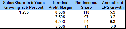 The Median P/E column is worth notice. Investors consistently overpay for stocks during periods of high margins. The median P/E during the 20 percent of the highest margin periods is 25. During the 40 percent of periods with the lowest margins, the median P/E has been less than 13. This isn't surprising. When earnings are weak, investors become frustrated and are unwilling to pay much even for a dollar of depressed earnings. The opposite is true after a long expansion in earnings. It's not difficult to guess what happens when investors buy richly priced stocks with high profit margins. The last two columns in the table show the returns of the median stock in our Large 500 portfolios. When profit margins were lowest, the median stock returned 15.7 percent over the next five years. When profit margins were highest, the median stock returned just 3.5 percent over the next five years. Profit Margin What-If ScenariosAging bull markets have a way of encouraging the abuse of what otherwise might be acceptable methods of analysis. The ratio of "price to forward earnings" is the current bull market's victim. If you assume that earnings will continue to grow at recent growth rates, you can make the market's P/E look quite attractive. But by taking into account the current levels of profit margins, a different set of expectations develops. With our historical profit margin series in hand, we'll run a few scenarios to highlight potential outcomes for future earnings growth. The companies currently in the S&P 500 have earned about $970 per share in sales over the prior 12 months. The net income on these sales has been about $82 a share. These numbers differ from the index level data found in Barron's and elsewhere because S&P adjusts its cap-weighted indexes by 'float adjusting' the index level data, counting only the shares that are available to investors. (This doesn't affect the analysis below, because we focus on the growth rates in sales and earnings and not their levels). We'll assume that the total sales of the companies in the index grow by 6% a year over the next five years. This has been the long-term growth rate of nominal GDP, (excluding a brief period of spiraling inflation in the 1970's). Assuming various profit margins five years from today, the table below shows the expected annual earnings growth that would result.