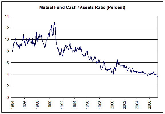 To offer an idea of exactly how stark the situation is, keep in mind that when money market yields (e.g. Treasury bill yields) are high, mutual fund managers have a greater incentive to hold cash balances than when yields are low. Norm Fosback of the Institute for Econometric Research used to account for this by adjusting the level of cash by the level of interest rates, so that the resulting figure is the "excess cash" above (or below) what would be expected, given prevailing interest rate levels.