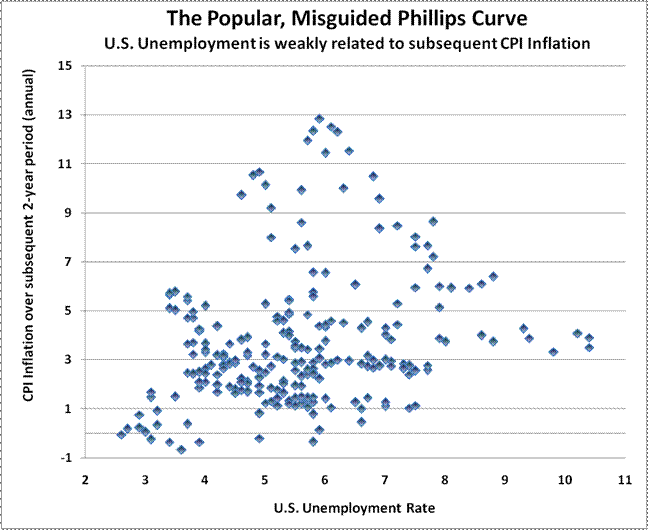April 4, 2011 Will the Real Phillips Curve Please Stand Up? Much of the intellectual basis for the Federal Reserve's dual mandate - "to promote effectively the goals of maximum employment, stable prices, and moderate long-term interest rates" - is based on the belief in what economists call the Phillips Curve. The Phillips curve, named after economist A.W. Phillips, is widely understood as a "tradeoff" between inflation and unemployment. The idea is so engrained in the minds of economists and financial analysts that it is taken as obvious, incontrovertible fact. High unemployment, the argument goes, is associated with low inflation risk, and in that environment, policy makers can safely pursue measures targeted at increasing employment, without undesirable consequences for inflation. You can see this blind acceptance of Phillips Curve thinking in Ben Bernanke's go-out-and-speculate Op-Ed in defense of quantitative easing, which appeared in the Washington Post late last year: "The Federal Reserve's objectives - its dual mandate, set by Congress - are to promote a high level of employment and low, stable inflation... low and falling inflation indicate that the economy has considerable spare capacity, implying that there is scope for monetary policy to support further gains in employment without risking economic overheating. The FOMC decided this week that, with unemployment high and inflation very low, further support to the economy is needed." In prior weekly comments, we've reviewed the weakness in Bernanke's argument that stock market fluctuations influence GDP, noting that every 1% change in market value is associated with a short-lived change of only 0.03-0.05% in real GDP. That result is strongly rooted in economic theory, since consumption and wealth effects are based on assets that are viewed to be "permanent," not on fluctuations in assets that are known to be volatile. Similarly, Bernanke's belief in the Phillips Curve is equally devoid of factual substance, despite its broad acceptance and simplistic appeal. The chart below shows the historical record, since 1947, plotting the U.S. unemployment rate against the subsequent rate of CPI inflation over the following 2-year period. The correlation is essentially zero (techically, it's slightly positive, implying no "tradeoff" at all in historical data). I should also note that the same lack of correlation holds between unemployment and inflation measured over the previous 1-2 year period.