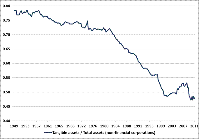 In going through the Flow of Funds data this week, I thought a few other features of the data were interesting. First, was the profound decline in tangible assets as a percentage of total corporate assets since 1980. This decline goes hand-in-hand with an increase in financial assets held by non-financial companies. At present, more than half of the total assets held by non-financial companies in the U.S. represent financial assets such as debt securities and equities. This is striking, in that we presently have a menu of prospective returns on financial assets that is among the most dismal in history. While the move toward zero interest rates has certainly been excellent for bonds when we look in the rear-view mirror, the fact that prospective rates of return are now so low suggests that a large portion of corporate assets are unlikely to achieve very much in the way of future returns, barring a decline in those asset prices. Something to think about.