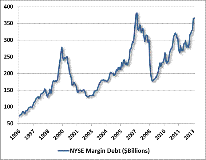 April 1, 2013 We Should Already Have Learned How This Will End Overvalued, overbought, overbullish. When in history have we seen the Shiller P/E (S&P 500 divided by the 10-year average of inflation-adjusted earnings) above 23, the S&P 500 over 60% above its 4-year low and 10% above its 52-week average, with investment advisory bears below 20% for at least two weeks running? Three times: the April 2010 peak, the March-May 2011 peak – both followed by corrections approaching 20% – and today. Even if one ignores the historical evidence suggesting the potential for significant bear market losses over the next couple of years, speculators should be aware that present conditions have been hostile even in the context of the recent bull market advance. I use the word “speculators” intentionally, as the historical evidence overwhelmingly indicates that there is little in the way of “investment” merit at present valuations. See Investment, Speculation, Valuation, and Tinker Bell for a review of the simplistic “forward earnings” measures universally touted by Wall Street here, compared with a range of distinct valuation approaches (including a far more effective use of forward earnings), all which reach nearly identical conclusions, and all which have a dramatically stronger relationship with subsequent market returns at every horizon. Our present estimate of prospective 10-year S&P 500 nominal total returns is now down to about 3.5% annually. Andrew Smithers out of London provides yet another metric based on Tobin’s q (market value versus replacement cost). The chart below is on log scale, so you have to do a bit of math to translate to percentage over/undervaluation, for example, exp(0.42) = 1.52, or 52% overvaluation. The chart is based on data through the end of 2012. Smithers notes “At that date the S&P 500 was at 1426 and US non-financials were overvalued by 44% according to q and quoted shares, including financials, were overvalued by 52% according to CAPE. With the S&P 500 at 1552 the overvaluation was 57% for non-financials and 65% for quoted shares.”
