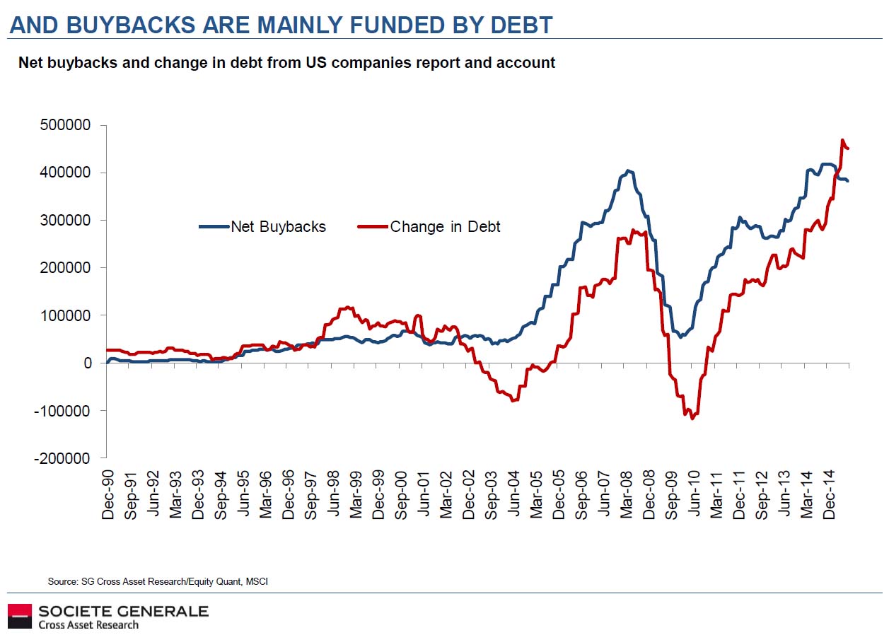 Investors don’t like to acknowledge bubbles. And because they’ve been so prone to deny them, bubbles (and their consequences) have become a recurring part of the financial landscape over the past two decades. During the late-1990’s technology/dot-com bubble, debt-financed malinvestment was mainly directed toward internet-related companies. The end result was a collapse in the Nasdaq 100 of -83%, while the S&P 500 lost half its value. By the 2002 low, the entire total return of the S&P 500 — in excess of Treasury bills — had been wiped out, all the way to back May 1996. It has taken yet another full-fledged multi-year speculative bubble to get the Nasdaq back to even (most likely only temporarily), and to bring the total return of the S&P 500 since 2000 to even 4% (again, most likely only temporarily). By the completion of the current market cycle, we fully expect that the total return of the S&P 500 since the 2000 peak will fall to zero or negative levels for what will then be a roughly 17-year span, and that the S&P 500 will have underperformed Treasury bills all the way back to roughly 1998; what will then be a nearly 20-year span. As a reminder of how unwilling investors are to acknowledge bubbles, one must remember that in 2000, even before the S&P 500 even reached its final bull market high on a total-return basis, a broad range of dot-com stocks had already collapsed by about 80% from their own 52-week highs. Investors were finally willing to acknowledge that bubble only after it collapsed, but somehow continued to believe that the bubble was contained only to dot-com companies, and continued to push the S&P 500 higher. Consider this gem from the Wall Street Journal, which appeared in July 2000 with the title “What were we THINKING?” “For a while it seemed that risk was dead. Now we know better... Why didn’t they see it coming? Arrogance, greed and optimism plus fear of being left out blinded people to the risks. After all, the dot-commers embraced risk. They prided themselves on their willingness to gamble and used it to justify their lucrative stock-option plans. Unfortunately, at the extreme far end of the risk curve, people lose perspective.” All of that apparent learning, stated in the past tense, might have been well and good were it not for the fact that the S&P 500 was still at record highs, at the most extreme valuation in history, and the broader collapse had not even started. The tech-heavy Nasdaq 100 was down -14% from its March 2000 high, but would go on to lose another -80% by its October 2002 low. Many of those companies were, and remain, outstanding businesses. But just as a parabolic stock price advance is no assurance that the underlying business is sound, having a sound underlying business does little to prevent an overvalued stock from collapsing once investors lose their taste for speculation. Investors have a habit of pointing to past bubbles as if they have actually learned something, even when they are in the midst of another one. By 2007, the S&P 500 had again reached record highs, though the market’s total return from the 2000 peak was still only about 2% annually. The preferred object of speculation during the housing bubble was mortgage debt. With the Federal Reserve suppressing yields to just 1% in 2003, yield-seeking investors found higher returns in mortgage securities, Wall Street jumped to create new “product,” credit standards were lowered, debt was “financially engineered” to bundle it in ways that could get a rubber stamp from ratings agencies, and unsound debt filled the portfolios of insurance companies, banks, and hedge funds. By the March 2009 low, the entire total return of the S&P 500 — in excess of Treasury bill returns — had been wiped out all the way back to June 1995. Investors, analysts, and economists look back on that bubble, and the global collapse that followed, as if they have actually learned something. So here we are, in what in hindsight will likely be called the “QE Bubble” — a moment in history where the most reckless and intentional encouragement of speculation by central bankers actually came to be viewed as not only acceptable but welcome. This is tolerated despite the fact that activist departures of monetary policy from simple rules (such as the Taylor Rule) have absolutely no correlation with subsequent economic activity. This is tolerated despite the clear evidence that yield-seeking speculation was the primary driver of malinvestment that created the housing bubble and economic collapse. We’ve still evidently learned nothing. The preferred object of debt-financed speculation this time around is the equity market. As for direct debt-finance of equity speculation, margin debt soared to more than $500 billion in April, 2.8% of GDP, eclipsing the 2000 and 2007 record highs. One should not compare margin debt to equity market capitalization, but rather to a fundamental; otherwise, the existence of a bubble in prices can make even alarming levels of margin debt appear reasonable. The recent level of stock margin debt is equivalent to 25% of all commercial and industrial loans in the U.S. banking system. Meanwhile, hundreds of billions more in low-quality covenant-lite debt have been issued in recent years. As a ratio of corporate gross value added, both corporate debt and the market value of corporate equities have climbed to the highest levels in history. Our friend Albert Edwards shares another interesting observation: the surge in corporate debt maps closely to the volume of net corporate equity buybacks.
