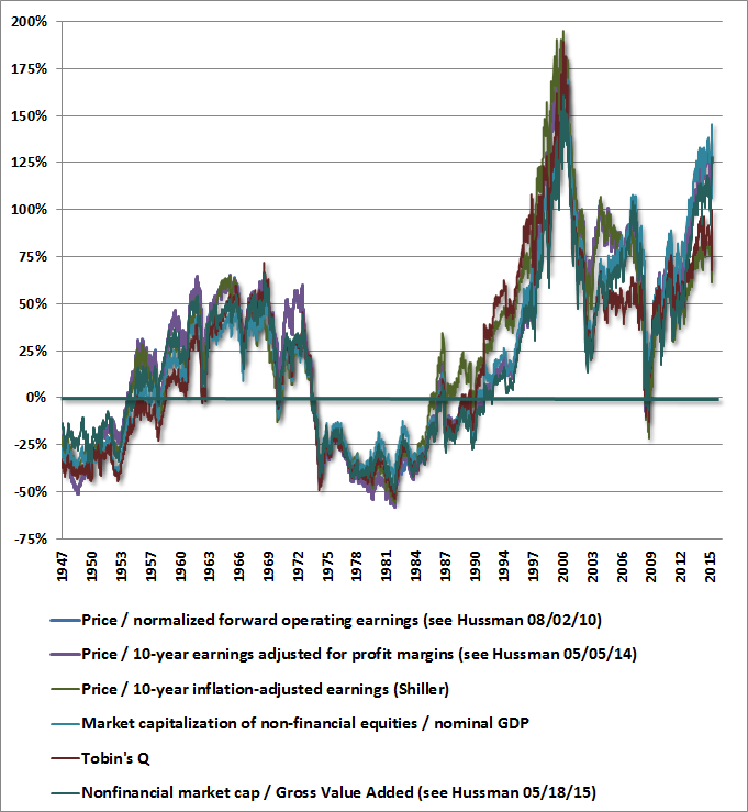 The preferred objects of speculation, and the greatest casualties of the 2000 bubble, were technology and dot-com companies. The preferred objects of speculation, and the greatest casualties of the mortgage bubble, were housing and the financial companies that held those mortgages. Recognize that because QE provoked such indiscriminate speculation, the recent extremes in the median price/earnings and price/revenue ratios, across all stocks, actually surpassed their 2000 peaks. Make no mistake: the preferred objects of speculation during the QE bubble have been low-grade debt and the entire stock market, indiscriminate of industry, sector, quality, or capitalization. We are now beginning to observe internal divergences that signal increasing risk aversion among investors. The greatest casualty of the QE bubble will also likely be low-grade debt and the entire stock market, probably just as indiscriminately. Investors don’t like to acknowledge bubbles. Yet somehow we have little doubt that a few years from now, they will look back at the present moment and ask that tragically perennial question: “What were we THINKING?” Choose your weapon As a brief valuation review, the chart below shows a variety of the most historically reliable valuation measures we identify, charted as percentage deviations from their historical norms. Note that raw price/forward earnings and the Fed Model are not among them, because their correlations with actual subsequent market returns are rather weak (though we’ve seen charts that make them look compelling as long as one ignores enough history). I wrote my August 20, 2007 market comment Long-Term Evidence on the Fed Model and Forward Operating P/E Ratios, to counter what I viewed as misguided claims of “reasonable valuation” at a time when, as now, historically reliable measures were quite extreme. That said, one can obtain a fairly useful valuation measure by adjusting the forward P/E to reduce the impact of cyclical fluctuations in profit margins. To obtain historical data before 1980, one has to impute based on other observable information (as explained in that 2007 article). That’s because forward operating earnings are an object created by Wall Street, not by Generally Accepted Accounting Principles. As I noted in Valuations Not Only Mean-Revert; They Mean-Invert, reliable valuation measures typically fully mean-revert within a 12-year horizon, meaning that there is no relationship between initial overvaluation (or undervaluation) and the level of overvaluation (or undervaluation) 12 years later. It follows that the most reliable horizon to relate valuations with subsequent equity market returns is also about 12 years. It’s also worth noting that since 1950, there has been no material relationship between interest rates and their level 12 years later. The following are the correlations, since 1950, between each valuation measure and actual subsequent S&P 500 nominal total returns over the following 12-year period. The correlations are negative because higher valuations are associated with lower returns: Shiller P/E: -84.7% correlation with actual subsequent 12-year S&P 500 total returns